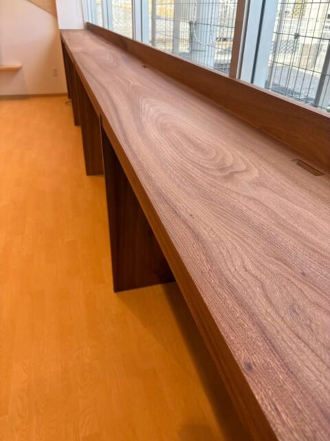 弊社では所有しております、超大型のプレス機を用いて、フローリング材を始めとして、各種化粧材をオーダー制作しております。そのノウハウを活かし、このような形での幅広・長尺のカウンター材も制作可能となっております。