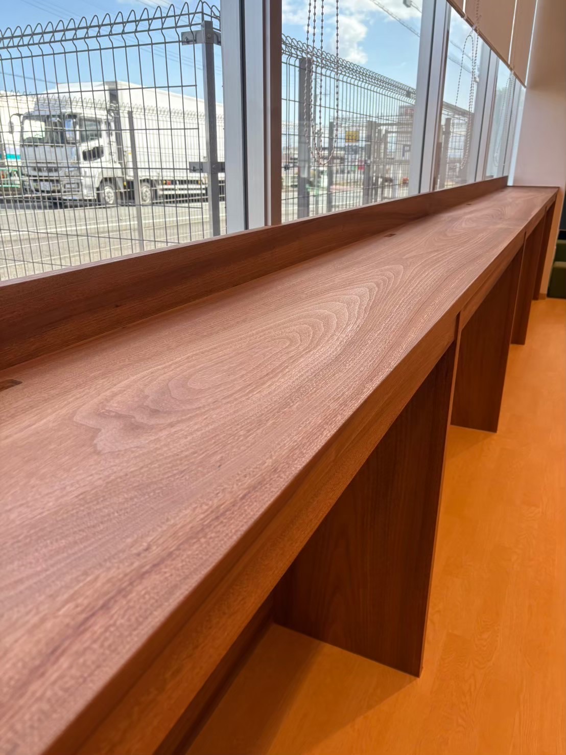 弊社では所有しております、超大型のプレス機を用いて、フローリング材を始めとして、各種化粧材をオーダー制作しております。そのノウハウを活かし、このような形での幅広・長尺のカウンター材も制作可能となっております。