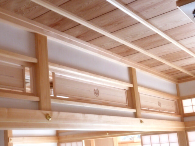 ・桧柾材で透かし彫り欄間を製作しました。繊細な家紋が綺麗に浮き出ています。