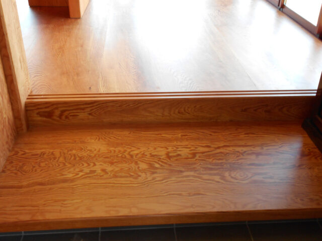 ・地場材である沼津松を使用した式台及び框、そして弊社自慢の超幅広フローリングです。幅が広いからこそ、木目を鮮やかに映えさせることができました。