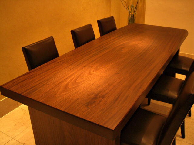 写真右下:こちらも楠一枚板のテーブルです。同材で脚材も製作しました。